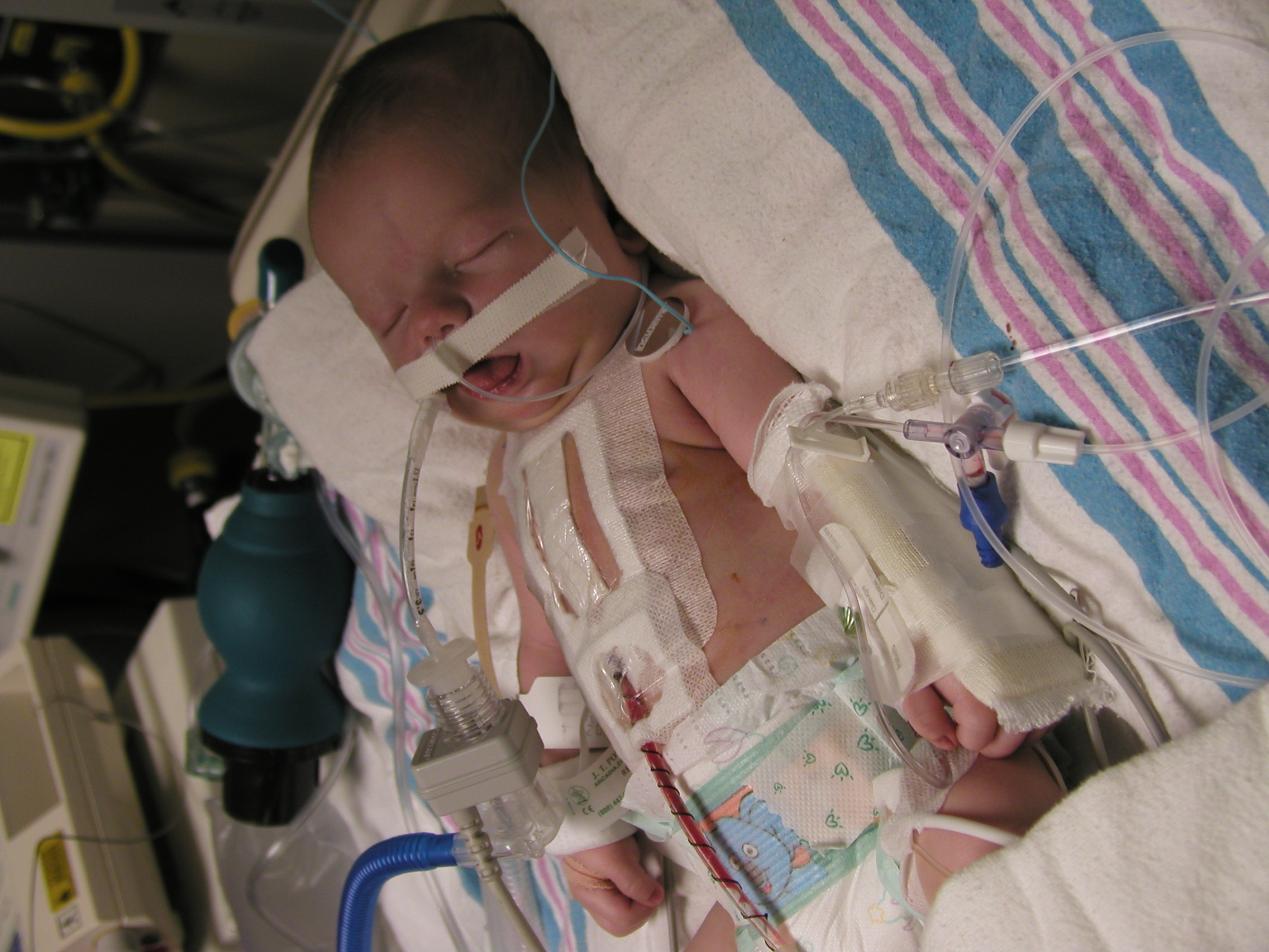 Corey had the B-T shunt surgery as an emergency on March 9, 2005. He was barely two weeks old. Just a little tiny baby. And he seemed fine. But the home pulse oximeter told a different tale. Corey’s oxygen saturation levels were in the toilet. We checked him in through the ER at Johns Hopkins, and he had his first surgery.