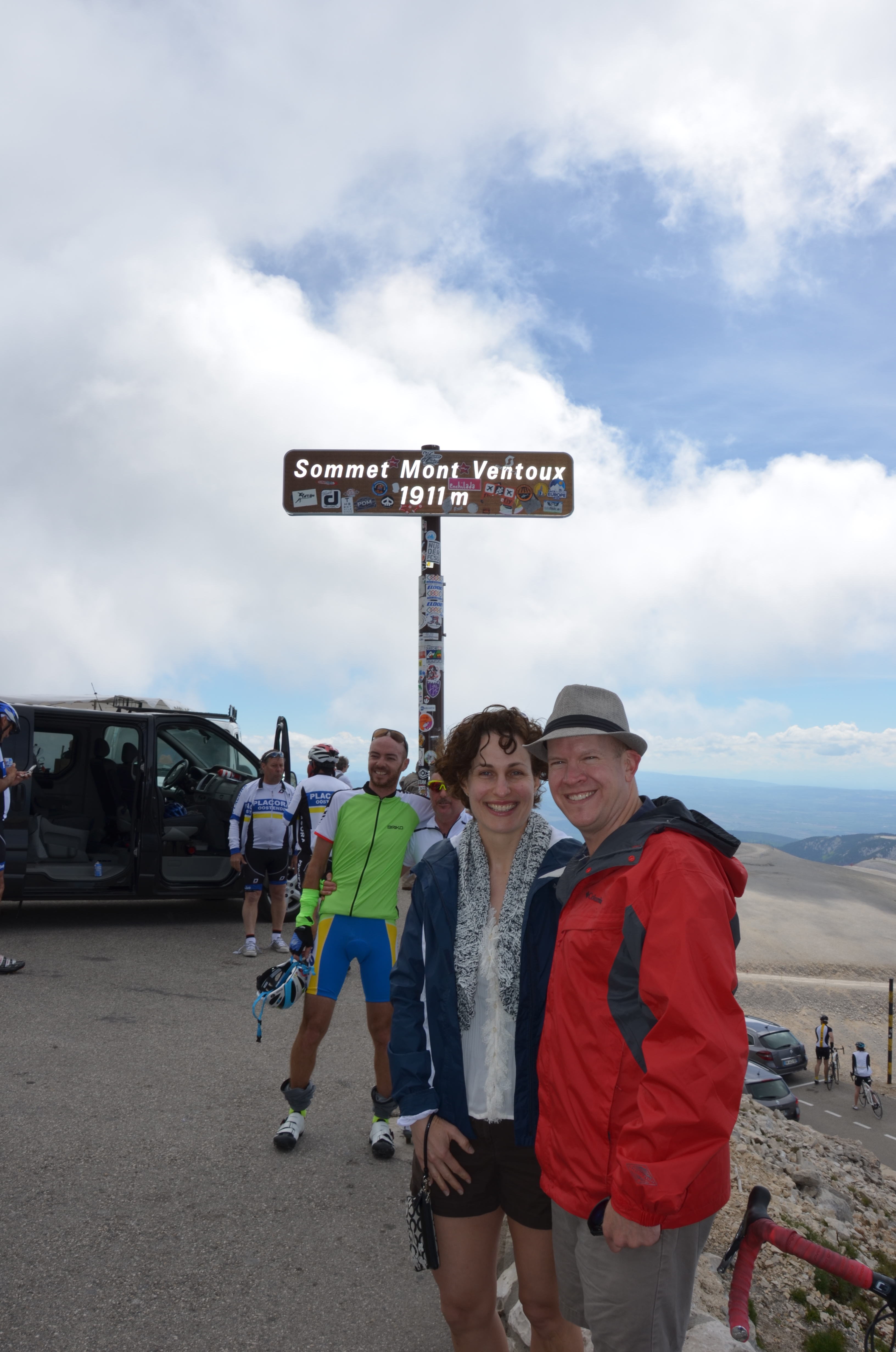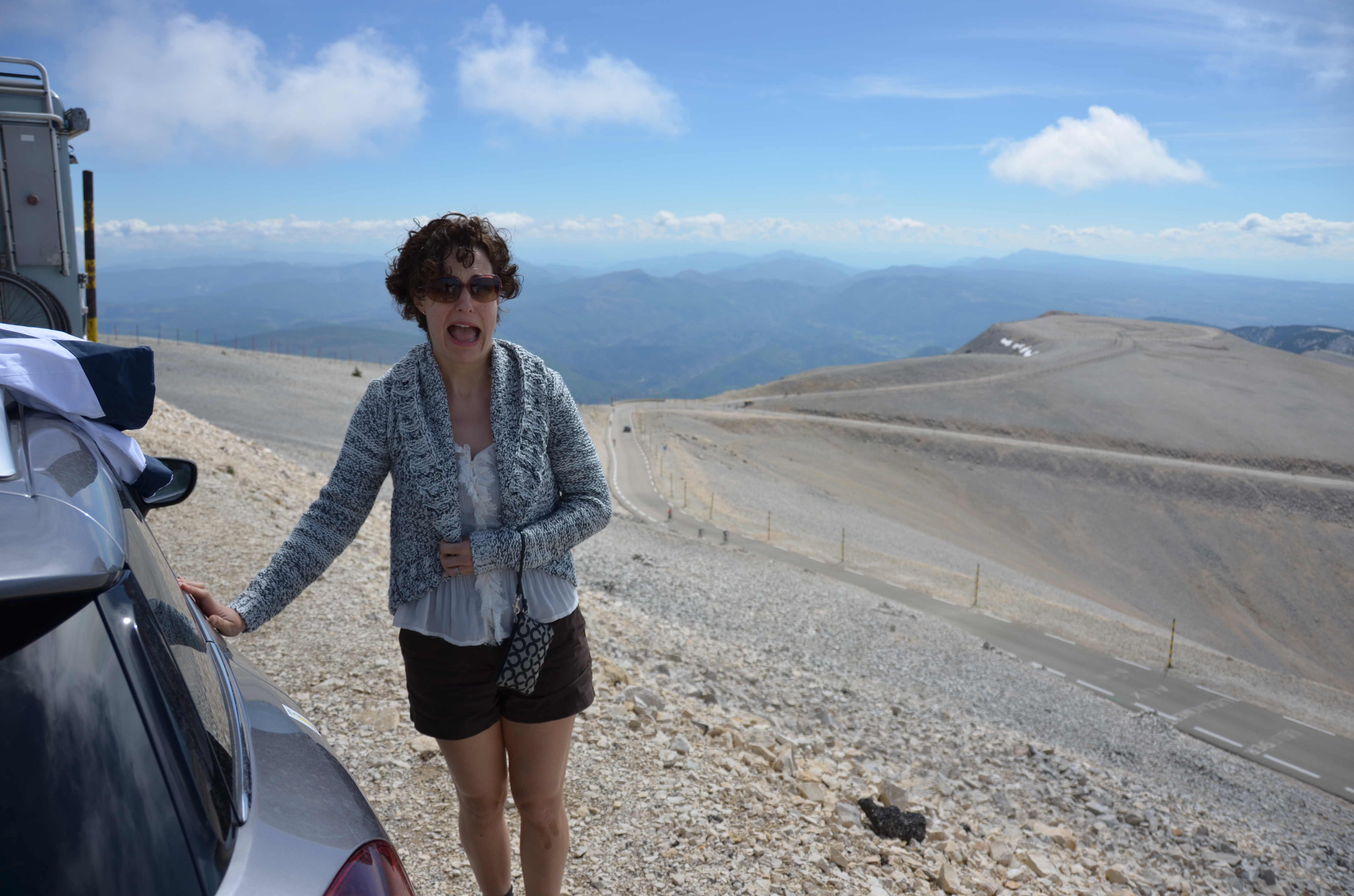 Thursday morning, May 29th, we lost our minds and thought, “Hey! Let’s drive up the side of a mountain today!” Mont Ventoux – yes, the one from The Tour de France. The summit is 1,912 m up, this mountain sports a nickname of “The Beast of Provence,” and did I mention that it gets windy at the top? As in 56 mph winds 240 days a year, and wind speeds of 200 mph have been recorded. And just because that isn’t enough fun for one day, let’s throw in a lot of bicyclists and an insanely steep/windy road with no guard rails.